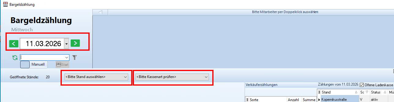 Im ersten Schritt muss das Datum gewählt werden. Anschließend wird in dem Feld "Bitte Stand auswählen" der gewünschte Stand hinterlegt. Die Kassenart die im Feld "Bitte Kassenart prüfen" angezeigt wird, wird dabei automatisch vorausgewählt. Hier gibt es drei Kassenarten: