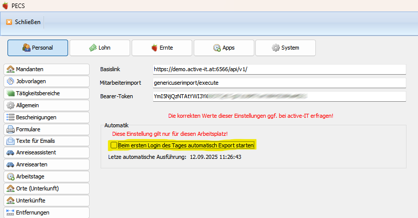 Ist diese Option aktiviert, wird die Schnittstelle automatisch beim ersten Login des Tages auf diesem Arbeitsplatz geöffnet und gestartet. Dabei werden die Einstellungen, wie sie zuletzt in der Schnittstelle angegeben wurden (z.B. bezüglich der zu exportierenden Stati) angewandt.
