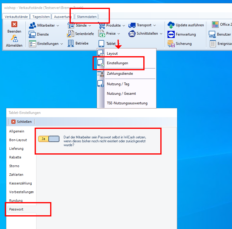 Unter Stammdaten - Tablet - Einstellungen - Passwort muss der entsprechende Regler auf "Ja" geschaltet werden.