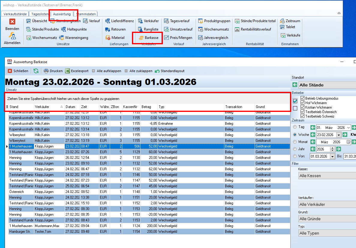Auswertung Barkasse Im Bereich der Auswertung gibt es eine neue Ansicht zur Bargeldbewegung.Über die Filter auf der rechten Seite können die gewünschten Ergebnisse angezeigt werden.Zusätzlich lassen sich die Überschriften der einzelnen Spalten in den markierten Bereich ziehen, so wird nach dieser Auswahl gruppiert. Veröffentlicht 31.03.2026 13:52