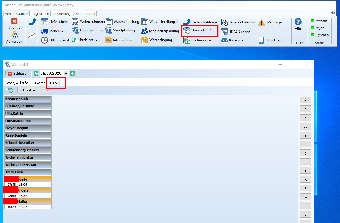 Hier werden Mitarbeiter angezeigt, die als Bürokräfte angelegt sind und sich über ein Zeiterfassungssystem wie witime oder wicash eingeloggt haben.