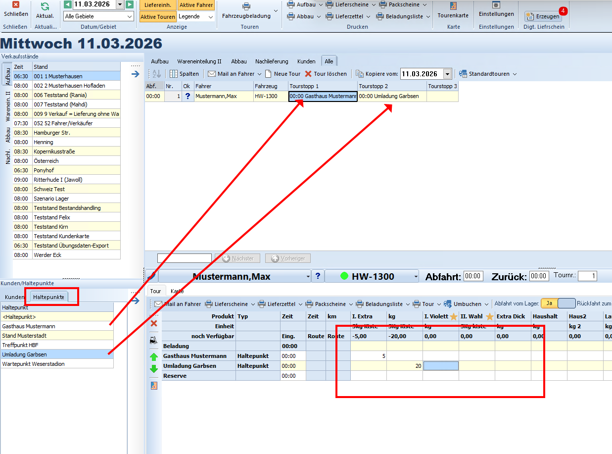 Die Zuteilung der Ware erfolgt dabei direkt in der Tourenplanung (wie bei einer Nachlieferung) außerdem ist ein Haltepunkt auch mehrfach auswählbar.