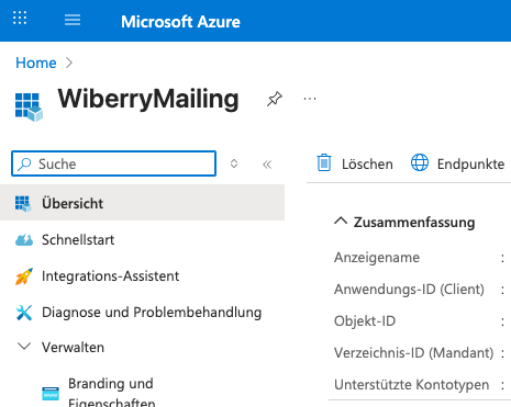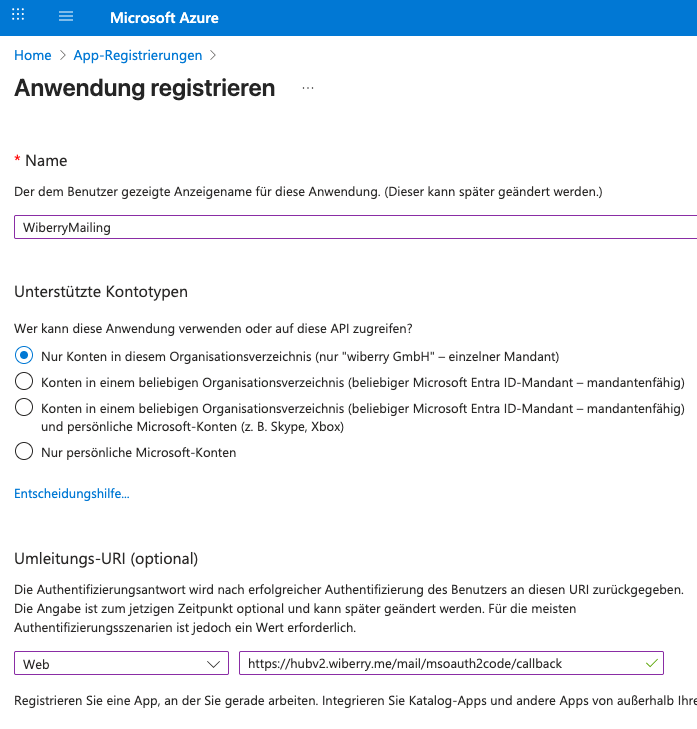 - Umleitungs-URL: Plattform = "Web", URI = "https://hubv2.wiberry.me/mail/msoauth2code/callback"