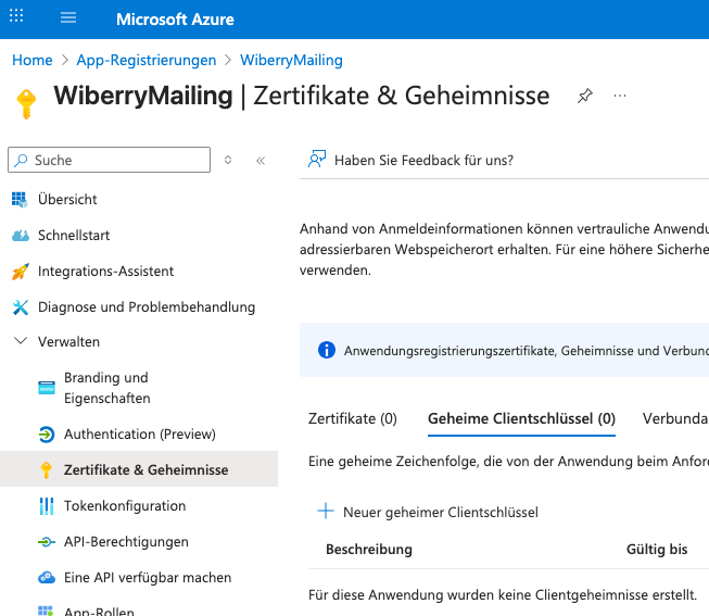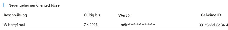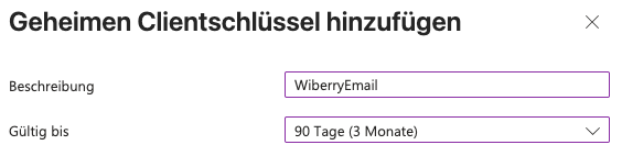 Dann in der erstellten App-Registrierung unter "Zertifikate und Geheimnisse" einen "Neuen geheimen Clientschlüssel" mit beliebiger Beschreibung und gewünschter Gültigkeit erstellen:
