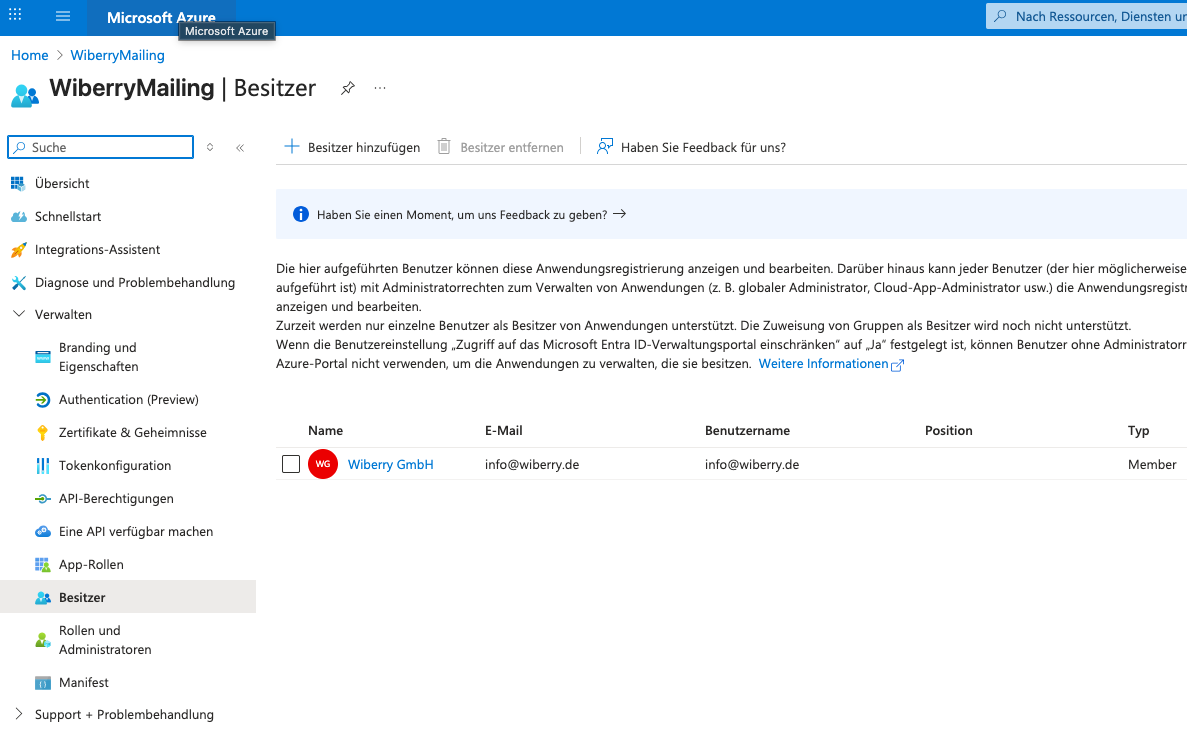 Nun den gewünschten Versender der Emails als Besitzer der App-Registrierung hinzufügen: