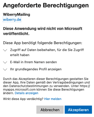 Die Einrichtung in der wicloud vornehmen (siehe https://ticket.wiberry.de/help/de-de/395/985) und sich dabei als der gewünschten Versender der Emails, der als Besitzer der App-Registrierung hinzugefügt wurde, anmelden und die "Angeforderten Berechtigungen" akzeptieren: