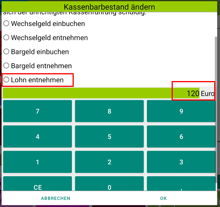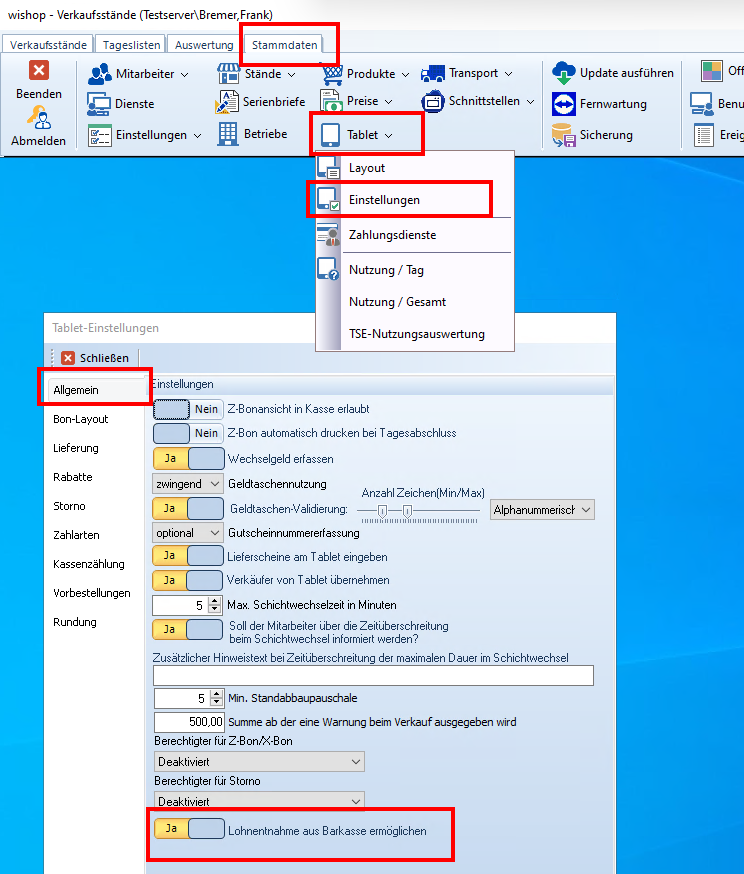 Stammdaten - Tablet - Einstellungen - Allgemein - Lohnentnahme aus Barkasse ermöglichen -> JA