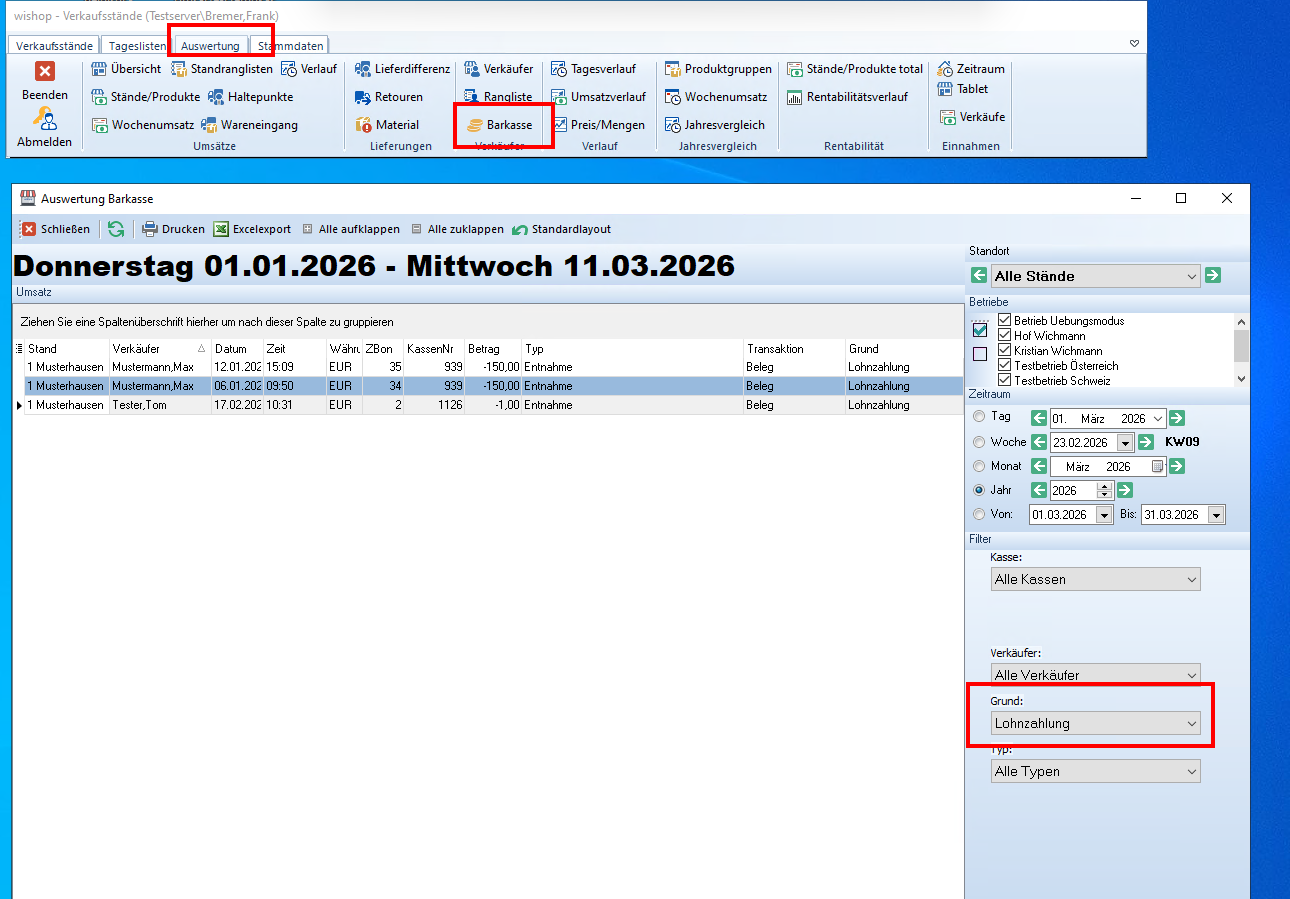 In der neuen Auswertung der Barkasse kann z.B. ein Filter auf Lohnzahlung gesetzt werden: