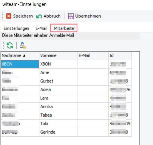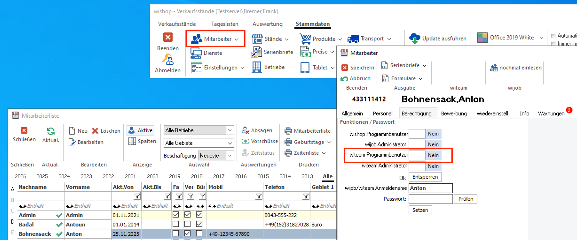 Im Register Mitarbeiter werden alle Mitarbeiter aufgelistet, den in Wishop eine Berechtigung zur Benutzung von