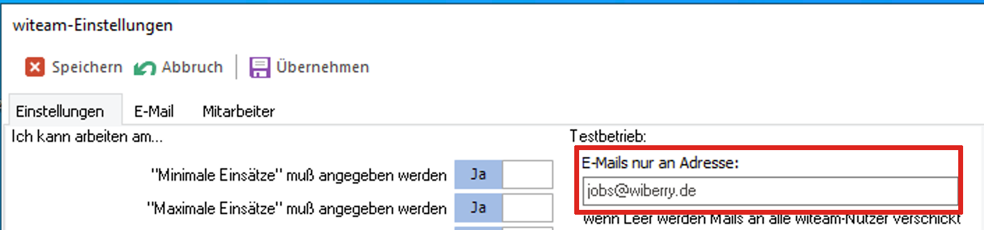 Der Testbetrieb ist aktiviert, wenn im Register Einstellungen im Bereich Testbetrieb das Eingabefeld Emails nur an Adresse gefüllt ist.