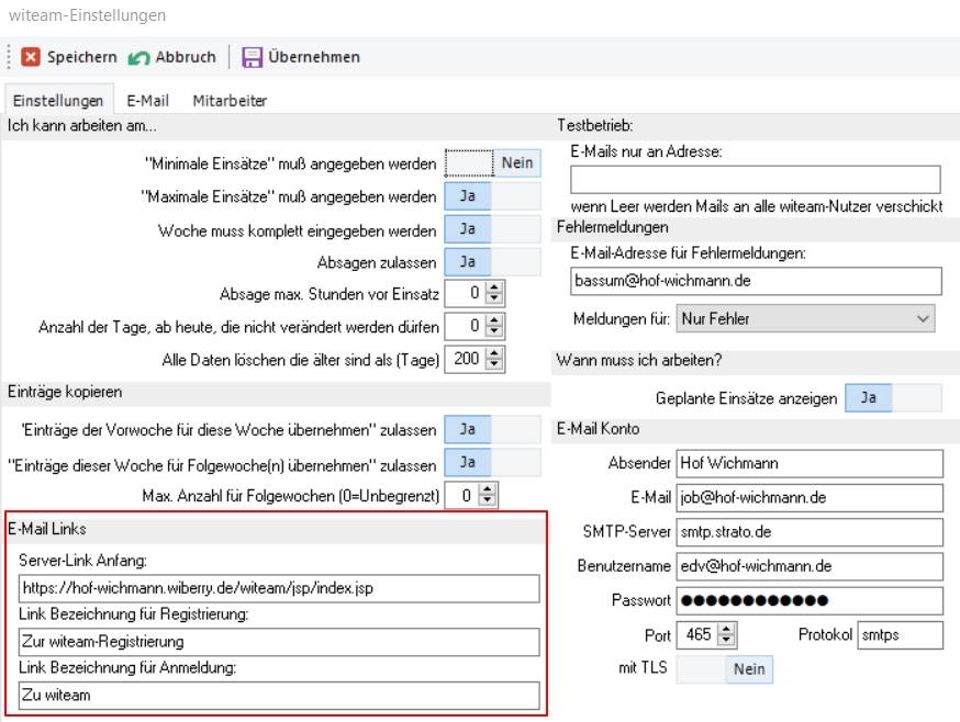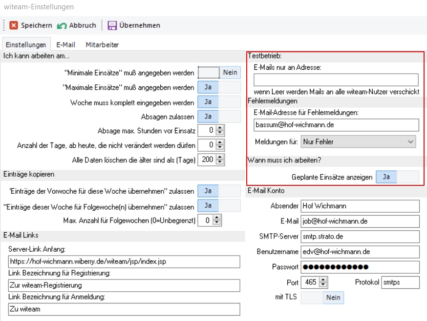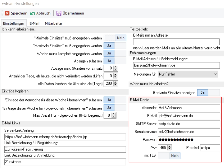 -> Einstellung zum Emailkonto, über dem Emails an die Mitarbeiter über witeam versendet werden