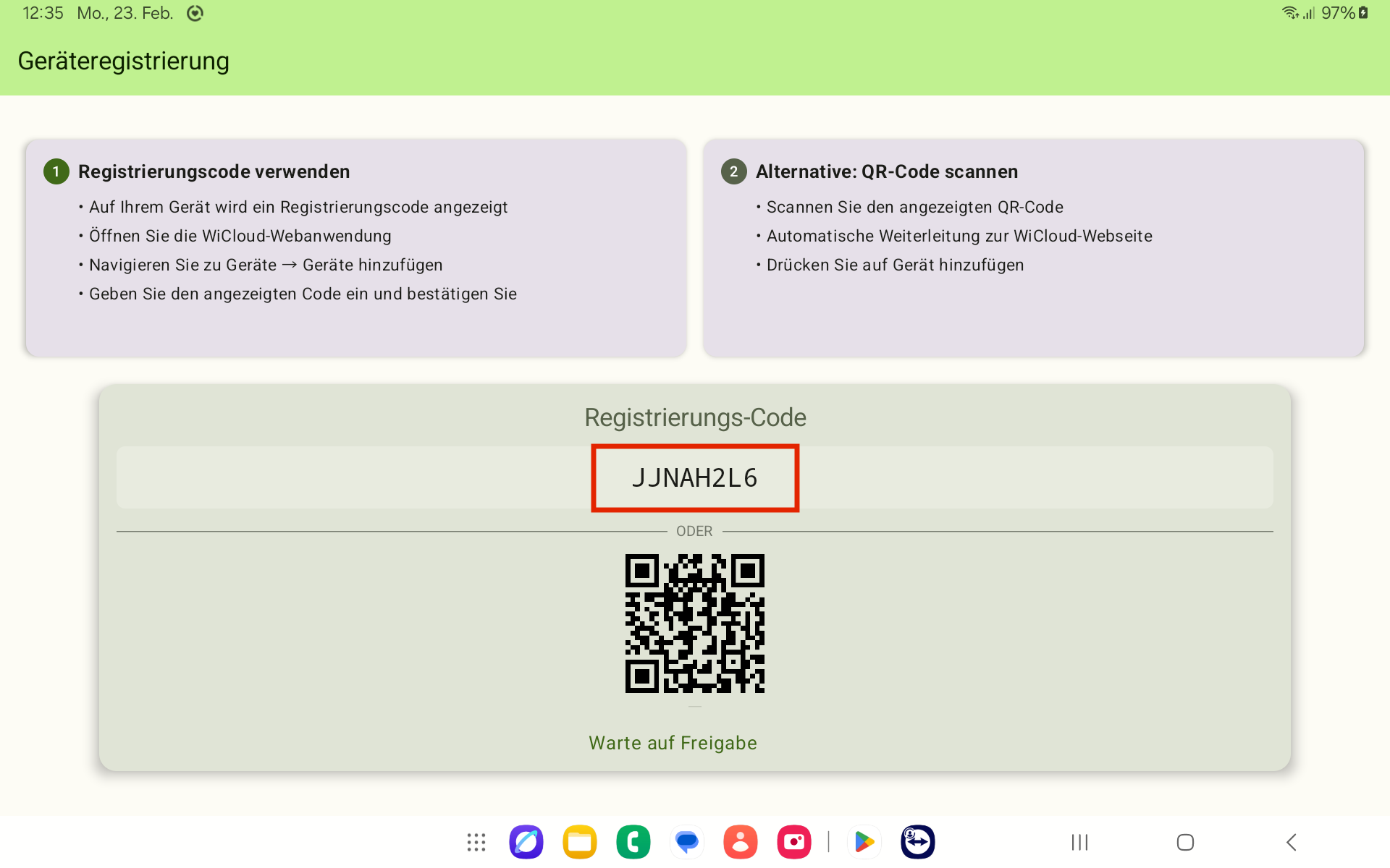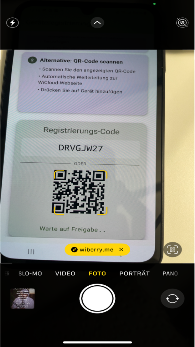 Für die Registrierung eines weiteren Geräts muss der QR-Code mit einer externen Kamera gescannt werden.