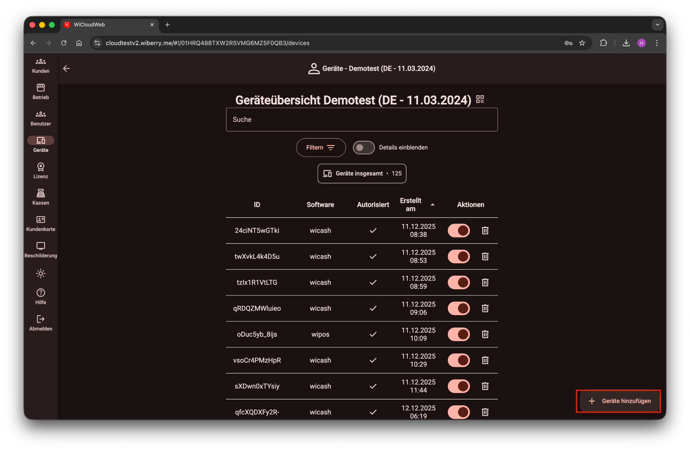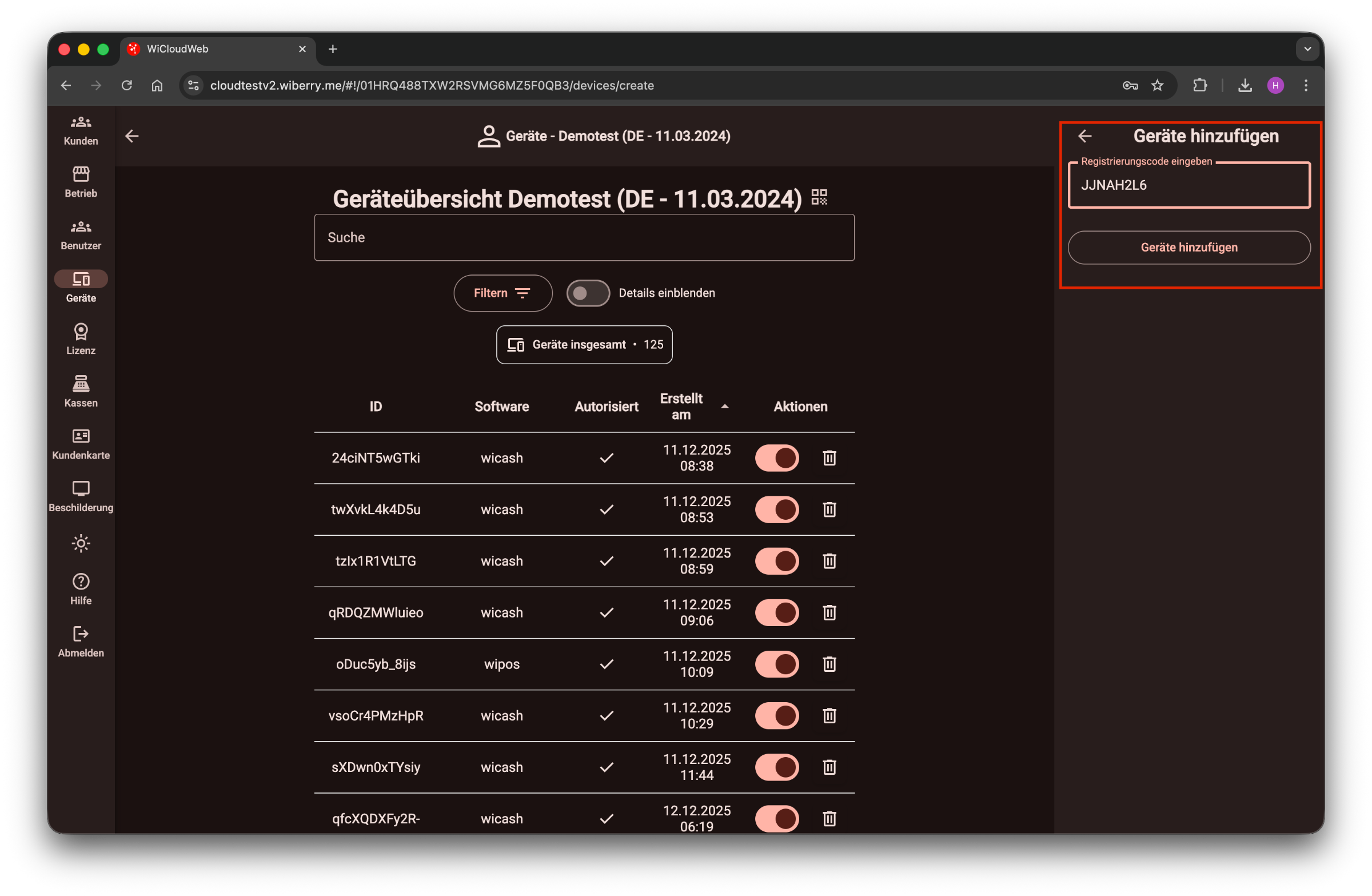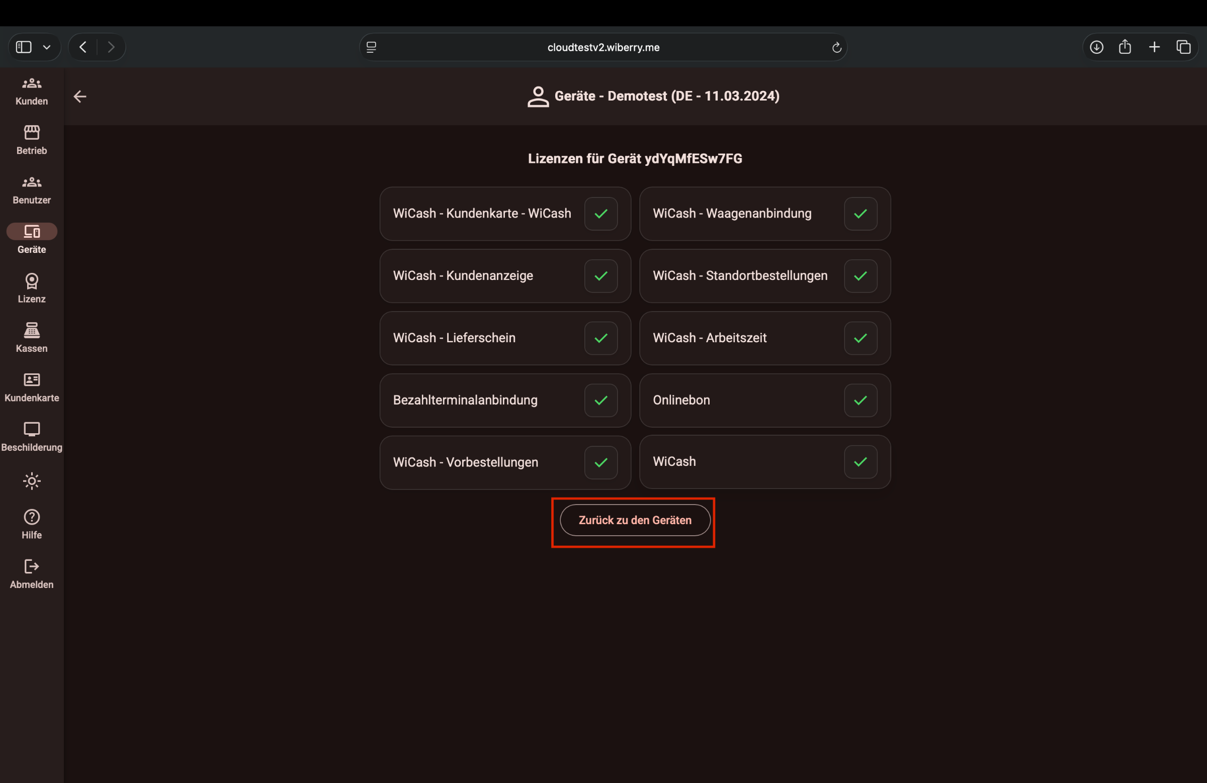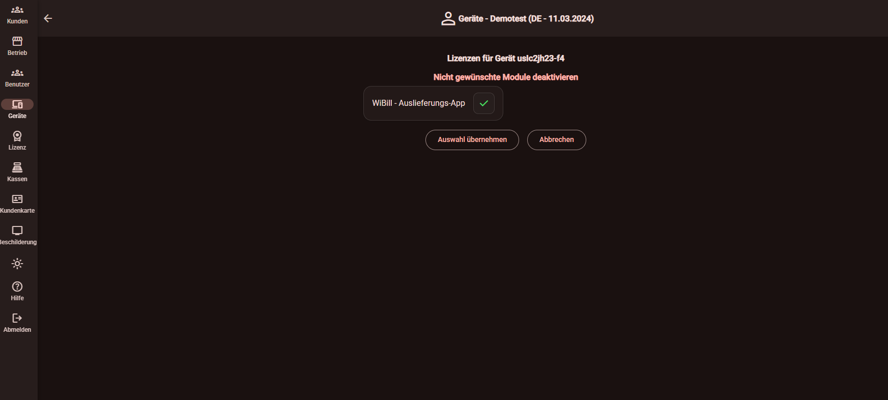 ACHTUNG: Dieser Ablauf ist nur in der neuesten wicloud-Version verfügbar und wird (wenn noch nicht verfügbar) zeitnah bereitgestellt. Stand heute (11.03.26) werden diese verfügbaren Lizenzmodule nicht automatisch angezeigt, sondern es muss das neu hinzugefügte Gerät angeklickt werden und dann aktiv der Haken bei Wibill AuslieferungsApp gesetzt werden