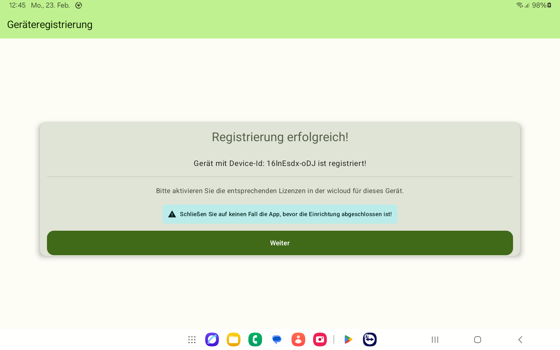 Nach dem Hinzufügen des Geräts erscheint in der WiDrive-App automatisch die Meldung „Registrierung erfolgreich!“ und wird eine Device-ID angezeigt.