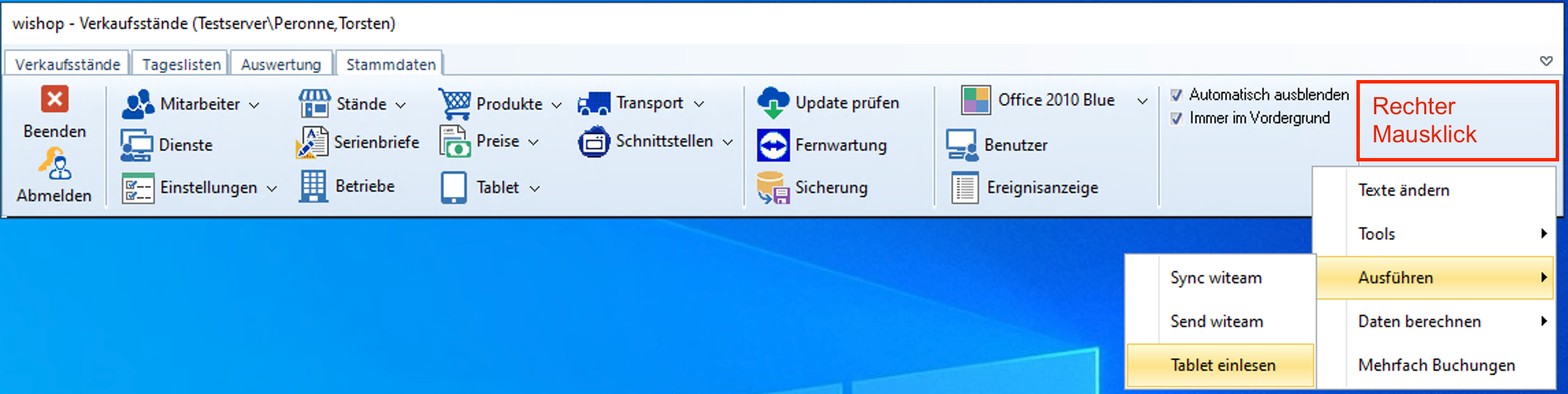 Anschließend öffnet sich ein zweites Menü mit dem Menüpunkt Tablet einlesen. Dieser Menüpunkt muss ausgewählt werden, um die Dtaen für den aktuellen Tag neu zu berechnen.